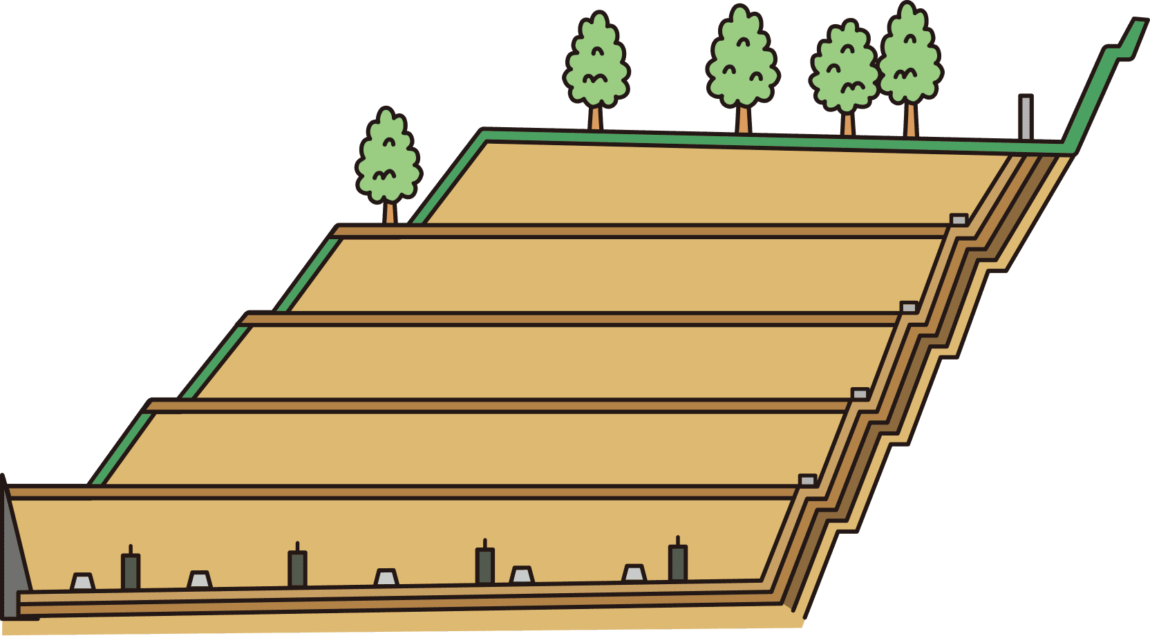 法律では埋立完了後も水処理などの管理を必要とします。そのため、埋め立て完了後の管理費として、前もって積立を行う必要があります。エスク岡山でも、処分場を運営している間に、埋立完了後の維持管理費用を積立、この費用をもって、閉鎖後の維持管理を行います。また、災害時の対策として、最終処分場の災害保険(補償額5億円)に加入しており、その他に赤磐市に「任意公害防止保証金」を採納しております。