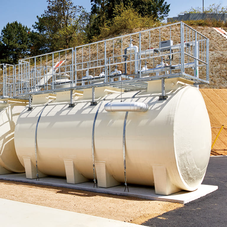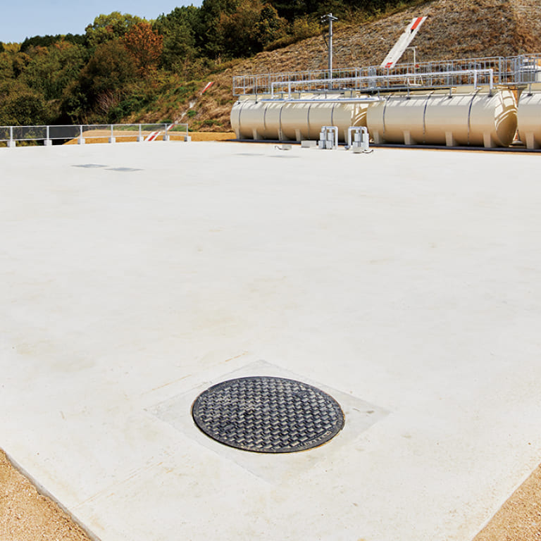 埋立地内から集められた浸出水を一次的に貯留する密閉式浸出水調整槽。一定量ずつ処理施設に供給する設備となります。